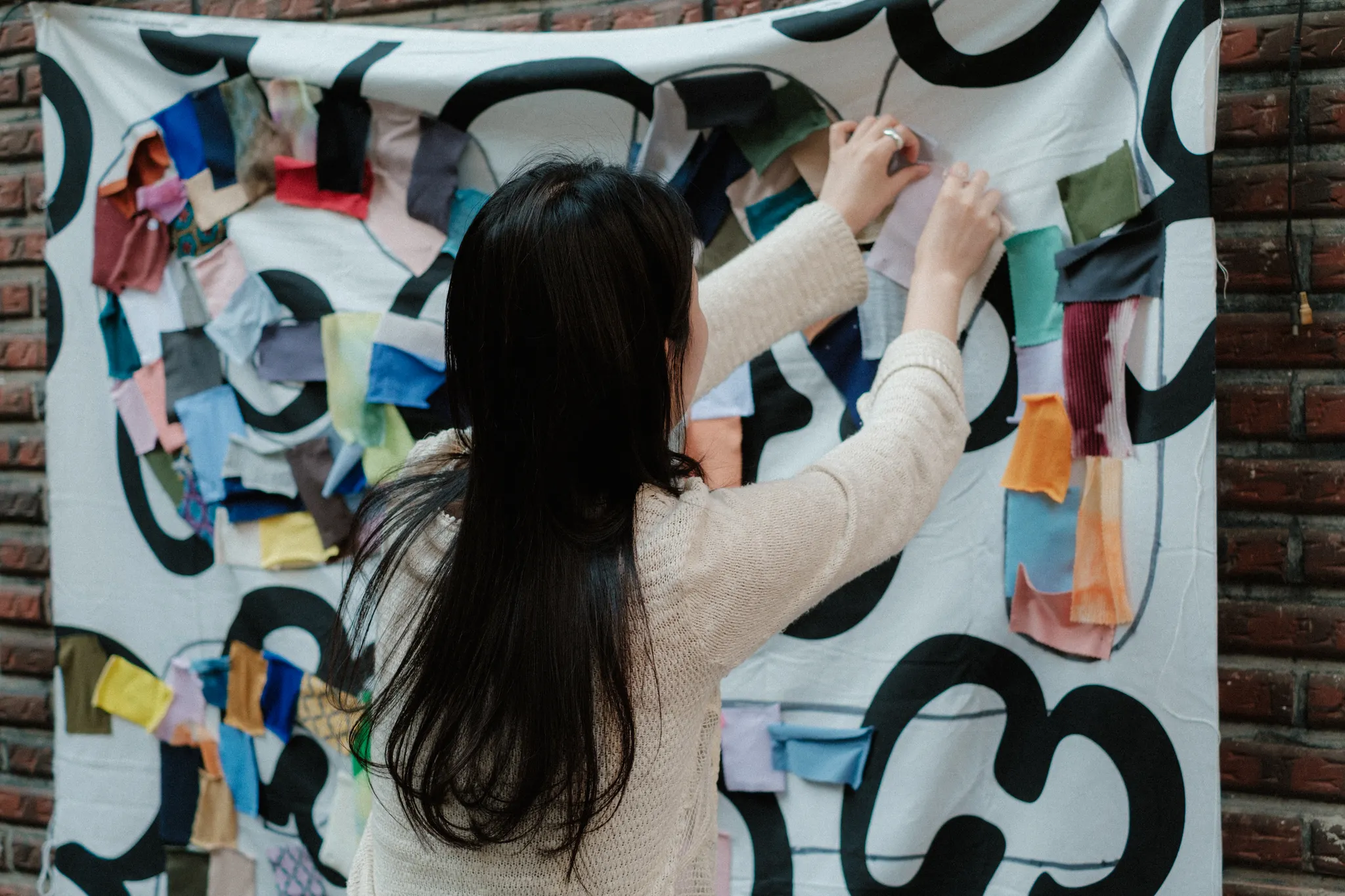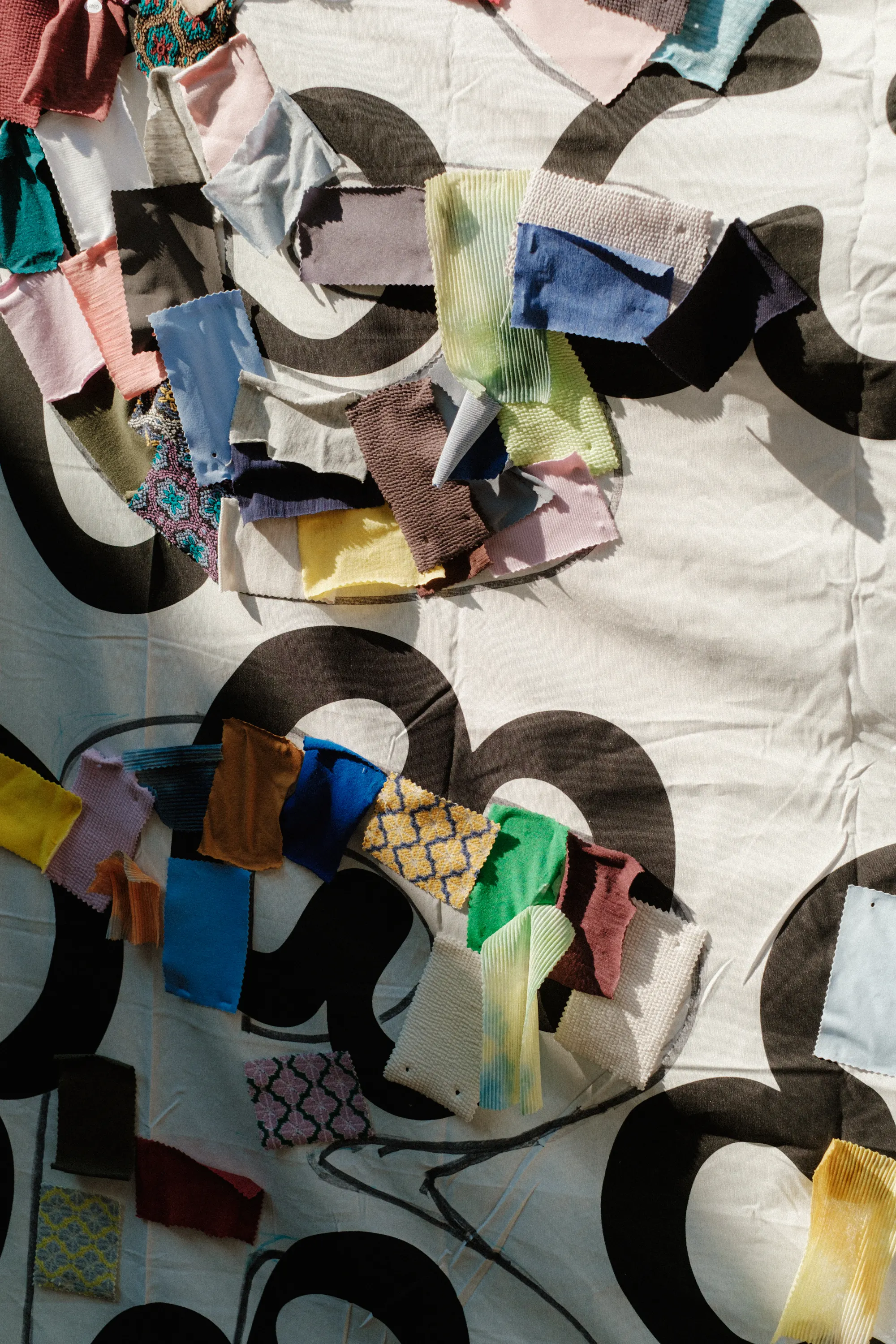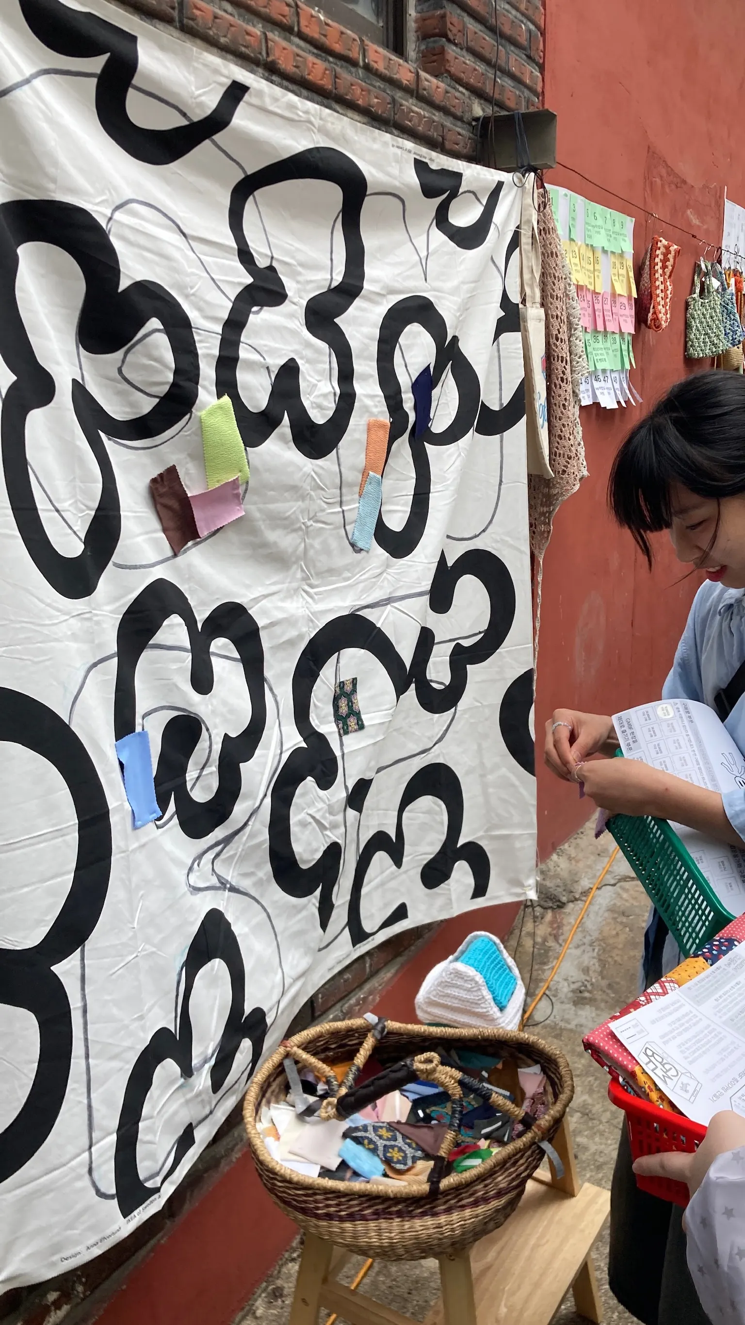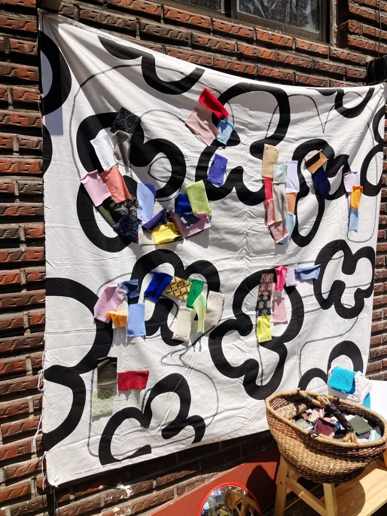 큰 천에 써있는 GMBF 네 글자의 바탕을 따라 작은 천조각들을 붙여 글자를 만들었습니다. 이 때 사용한 천조각 역시 샘플 패브릭으로 만들어지고 더 이상 쓸모가 없어 버려질 일만 남은 것들이었어요. 방문객들이 안 쓰는 옷이나 천 조각을 가지고 오기도 했습니다. 그렇게 버려질 뻔한 천들이 조각조각 모이니 알록달록한 글자가 되었습니다.