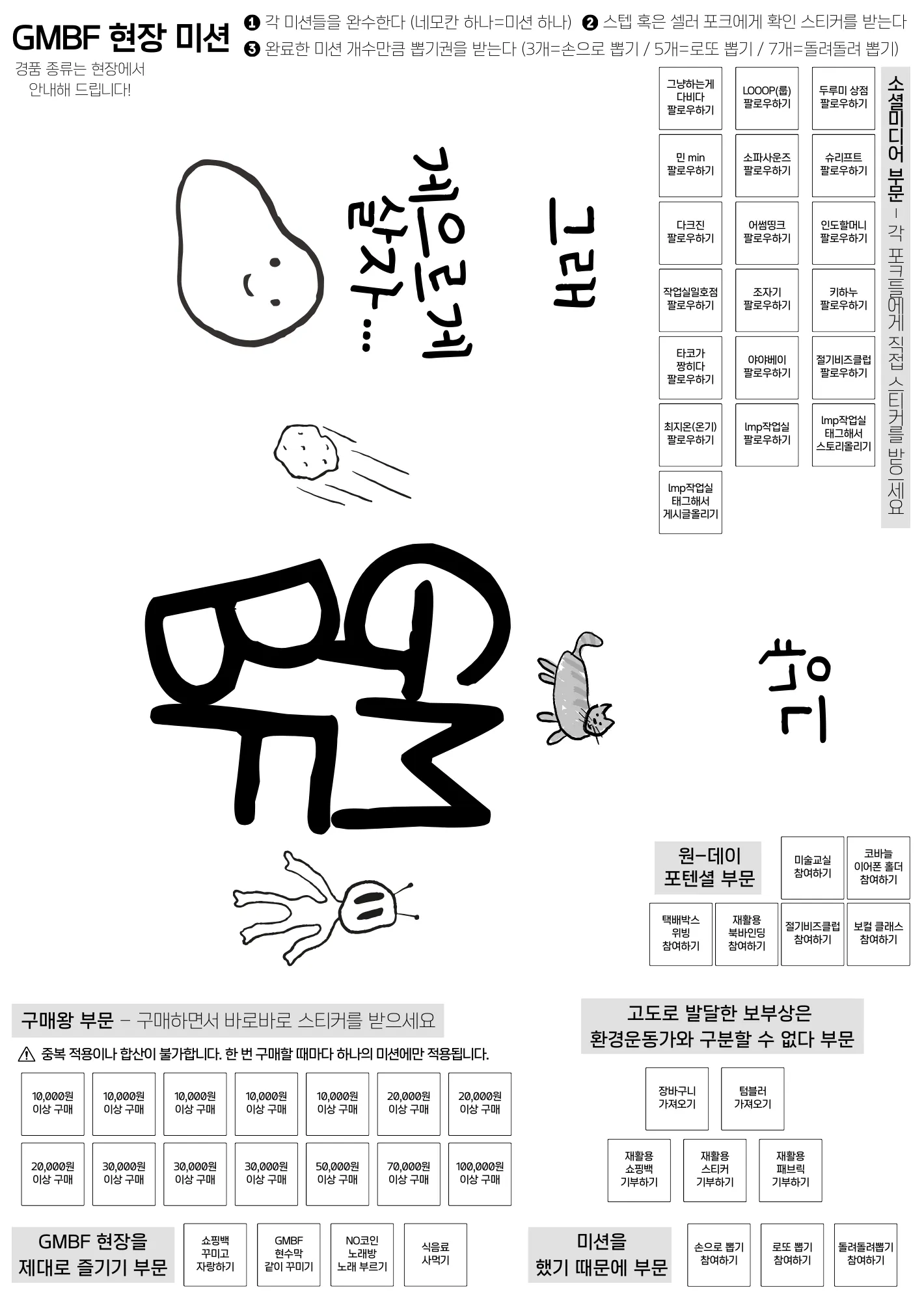 떠들썩한 축제 분위기를 내기 위해 꼭 있어야 하는 현수막. 하지만 한 번만 쓰이고 버려질 현수막을 제작하는 데에 고민이 뒤따랐습니다. 그래서 두고두고 계속 쓸 수 있는 GMBF 현수막을 방문객들과 함께 만들기로 했습니다.
