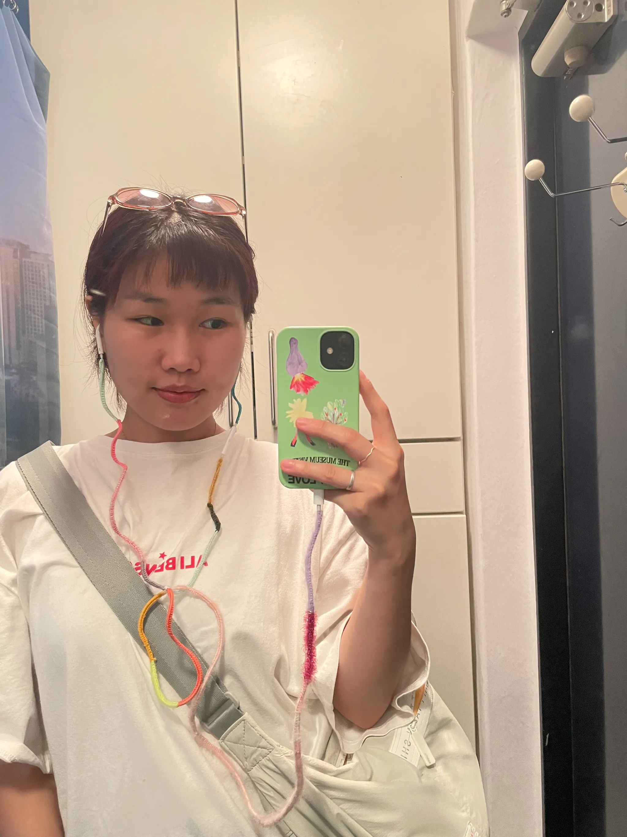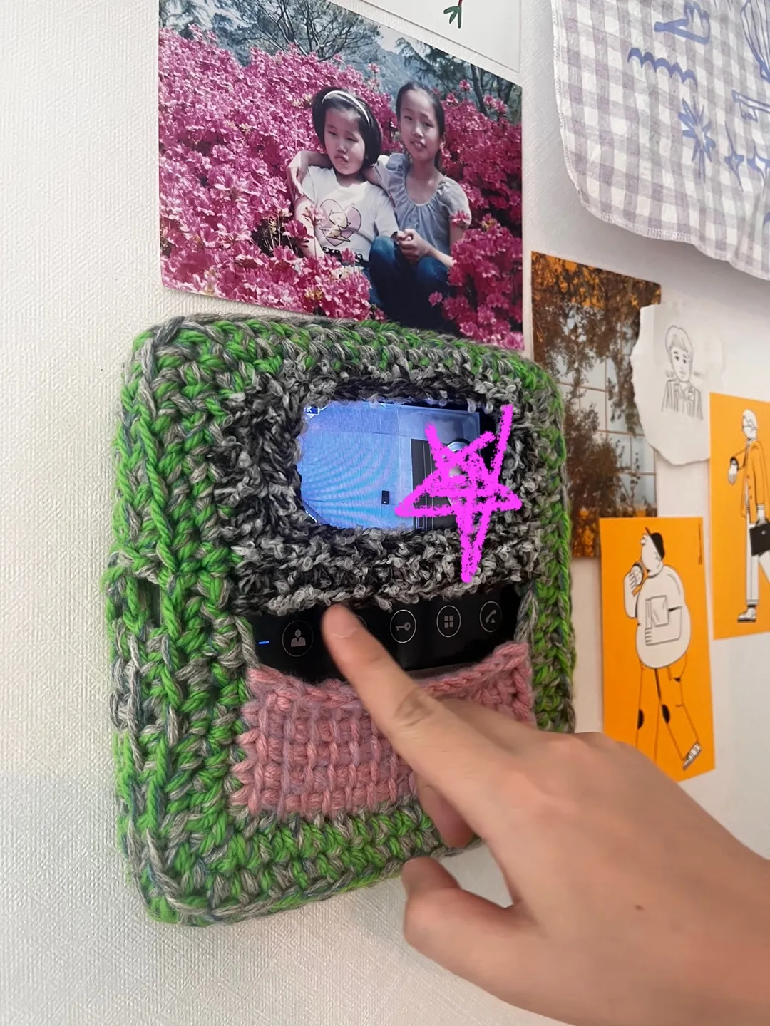 전세집의 인터폰이 너무 못생겨서 뜨개로 감싸버렸어요.