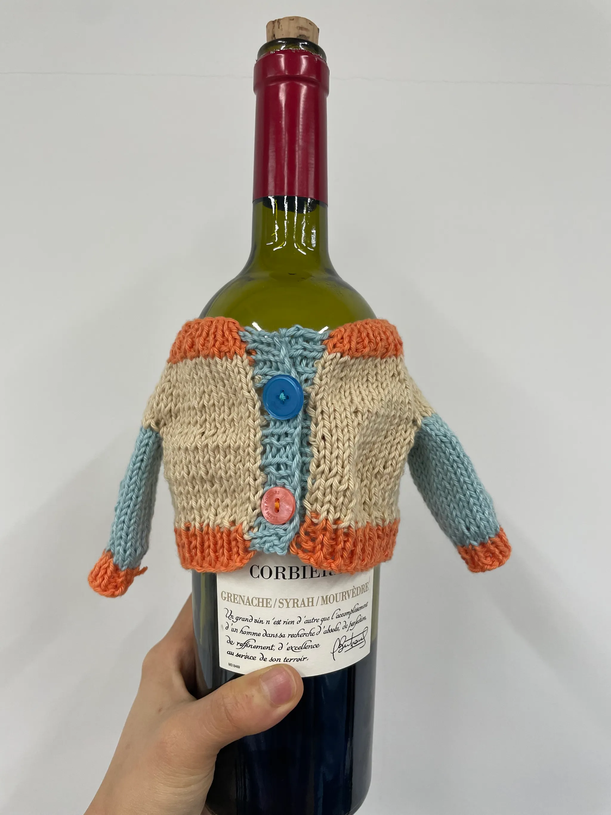 와인을 선물할 때 그냥 주고 싶지 않아서 와인병이 입을 가디건을 떠보았어요.