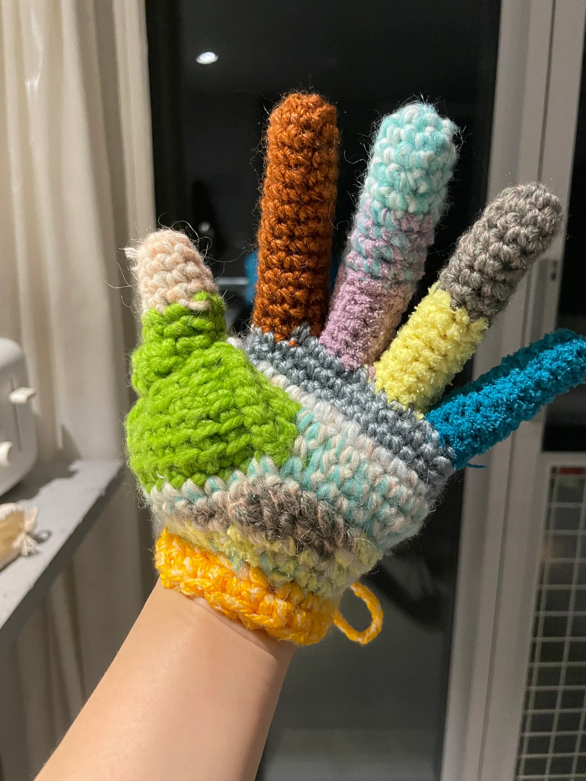 딱히 장갑은 아니고 손 모양 오브제를 뜨고 싶었는데 손을 끼워보니 쏘옥 들어갔습니다.