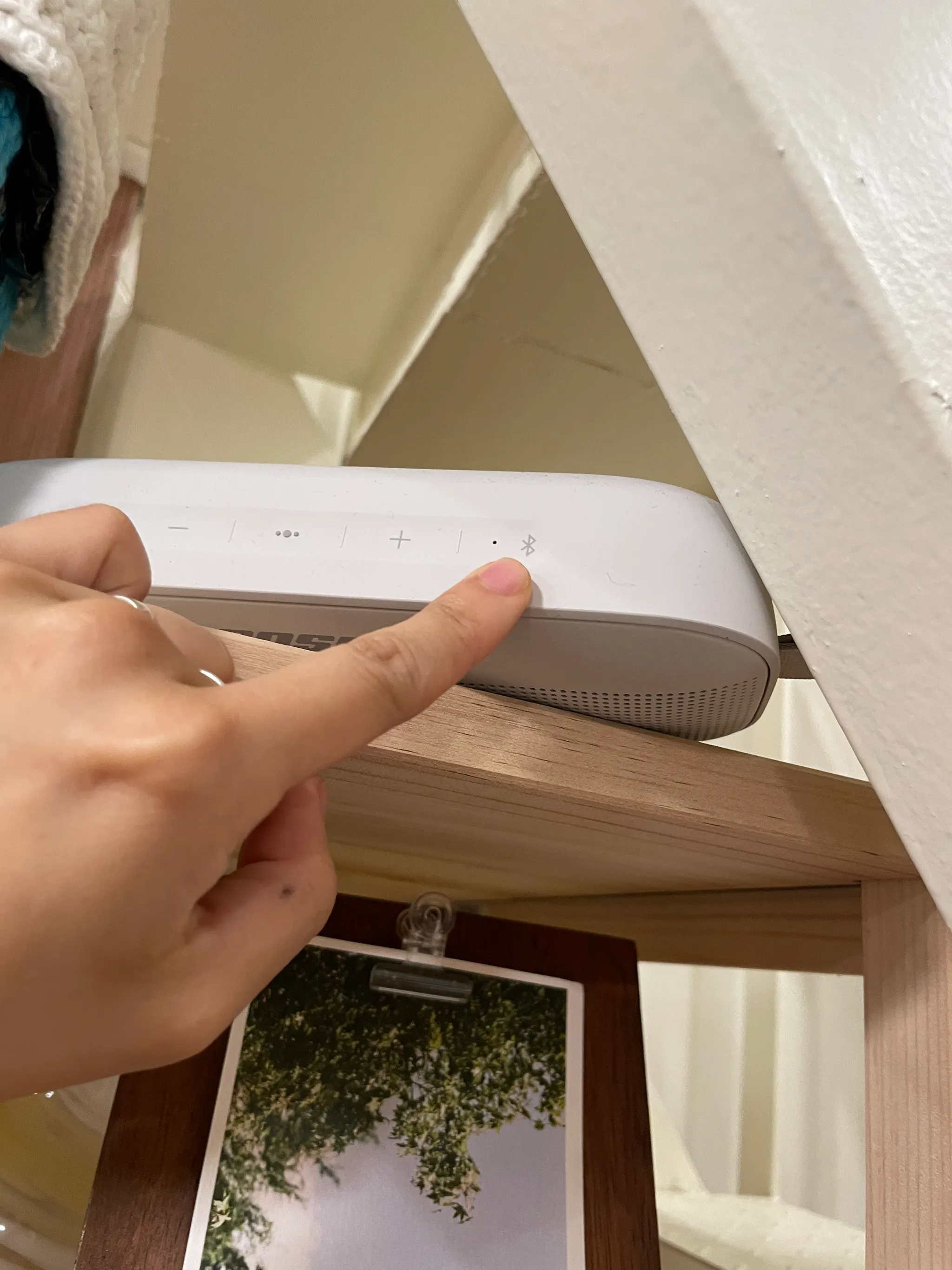 계단 밑 선반에 보스 블루투스 스피커가 있습니다.