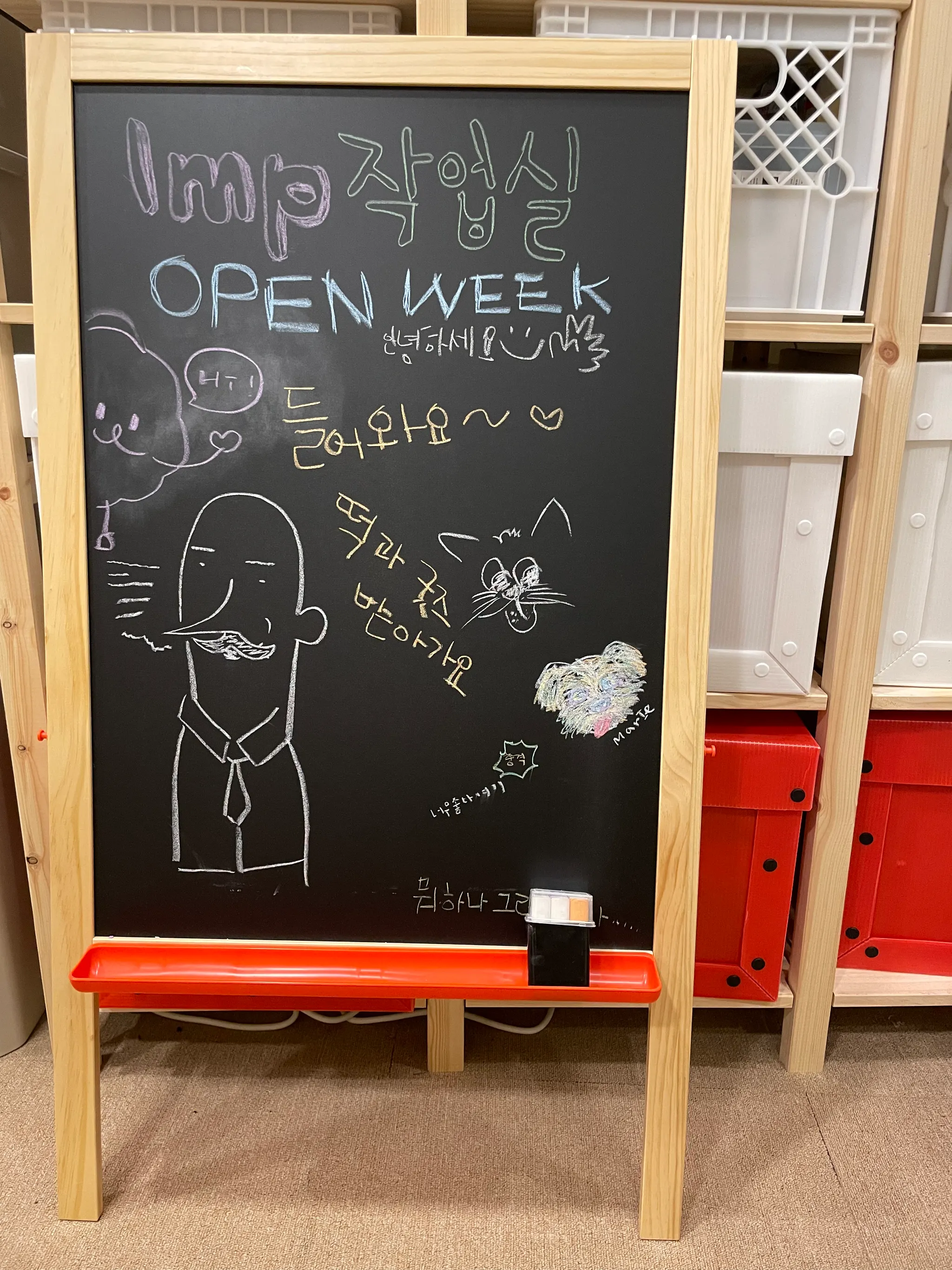 분필, 보드마카 등으로 자유롭게 이용하세요. 보드마카와 지우개는 창문 아래 책장에 있습니다.