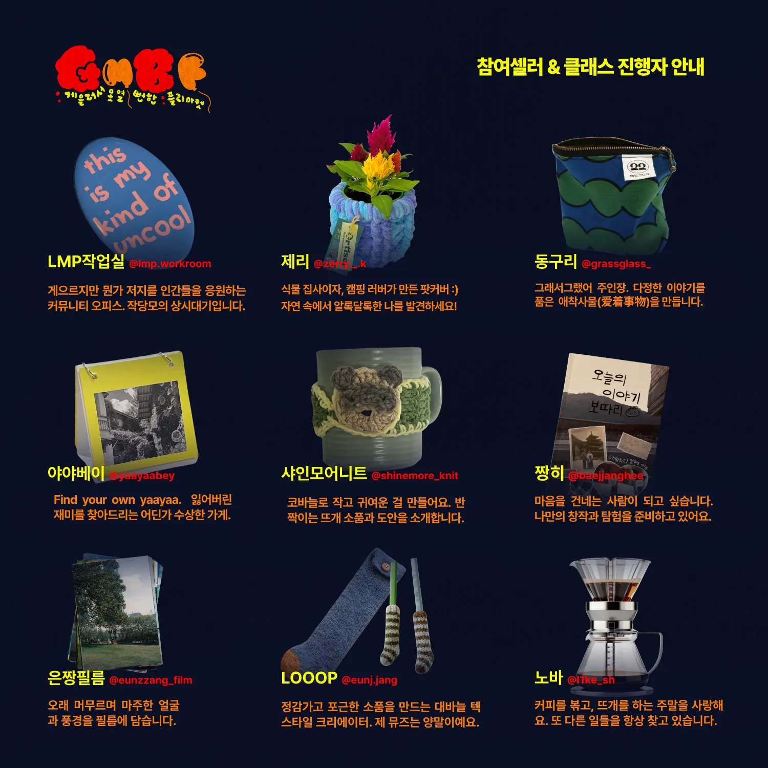 와보면 놀라게 될 걸요. 새로운 아이디어와 기획이 반짝이는 상품들, 큰 규모의 브랜드에서는 좀처럼 보여주지 않는 독특한 서비스, 열정 가득 담긴 셀러들의 눈망울과, 곧 크게 될 것 같은 가능성 있는 창작자를 찾아내는 기쁨까지! 이 모두가 GMBF에 있습니다.