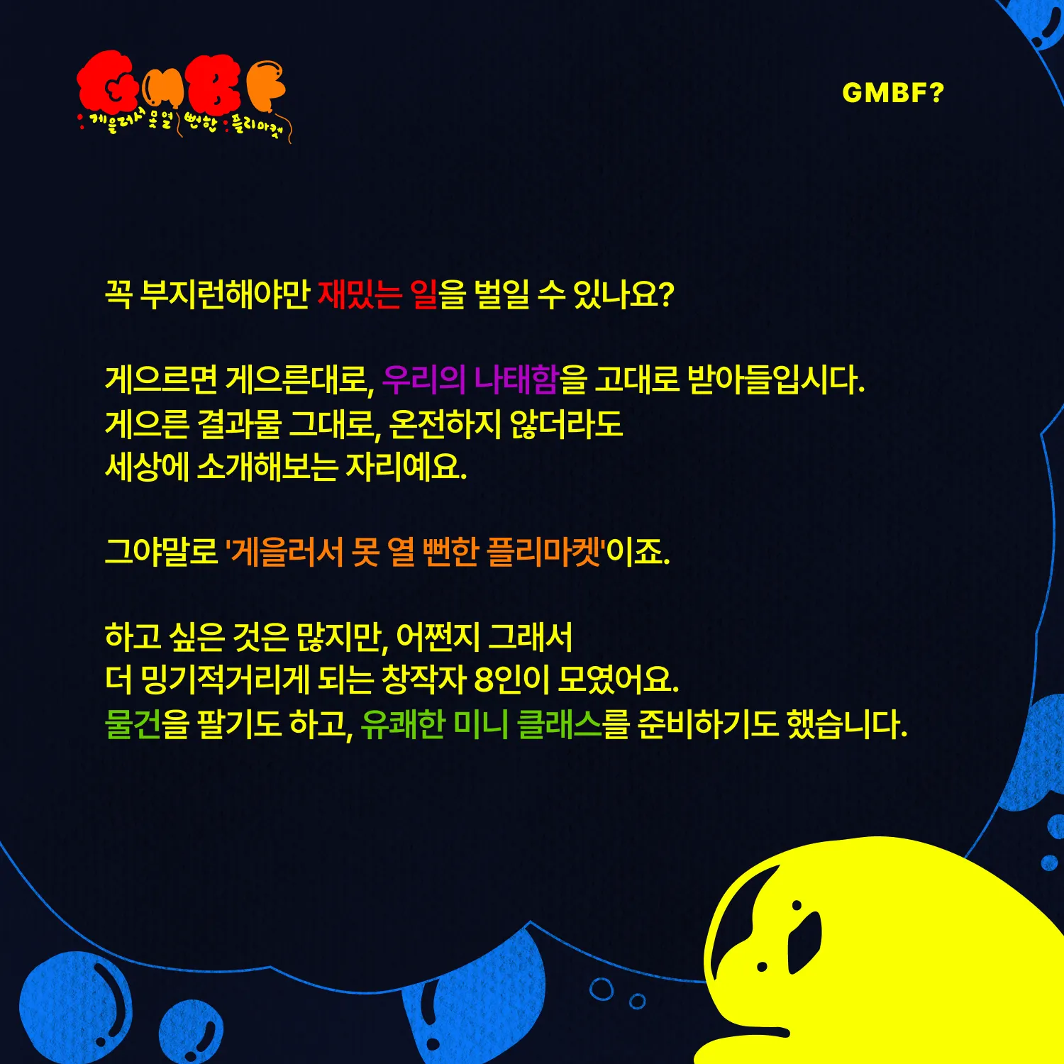 게을러서 못 열 뻔한 플리마켓, GMBF에는 규모있는 브랜드나 크리에이터들만이 모이는 자리가 아닙니다. 아직 사업을 시작하지도 않았거나 처음으로 자신의 상품을 팔아 보는 이들도 있어요. 잘 알려진 크리에이터, 규모 있는 브랜드라고 하더라도 그들이 GMBF에서 선보일 결과물은 B급 상품이거나, 접어뒀던 아이디어있거나, 기존에 시도하지 않았던 새로운 것들이어야 합니다.